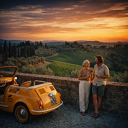 Full day in Chianti—vineyards, medieval villages, easy pace. Florence pickup + private r/t transfer; electric vintage Fiat 500 cabrio: scenic roads, curated stops, tasting with local products. Price per car (up to 3 guests). OVERVIEW No driving/meeting points/logistics: private transfer from Florence, then a paced Fiat 500 cabrio tour through iconic villages & panoramic roads. (Small private fleet—limited availability.) Tasting with selected local products included. Lunch flexible (Classic) or fully arranged villa lunch (All-Inclusive). Perfect for: • couples • honeymooners • small private groups • slow-travel lovers WHY THIS TOUR SELLS OUT (and why guests love it) • Full-day private, relaxed, no crowds • Private r/t transfer from Florence • Electric vintage Fiat 500 cabrio—quiet, stylish, panoramic • Greve in Chianti, Montefioralle, Panzano in Chianti • Tasting + photo stops (driver-guide uses your phone) • All-In: villa lunch included WHAT’S INCLUDED • 7h ±20 private day • Private r/t transfer Florence↔Chianti (van) • Electric vintage Fiat 500 cabrio + professional local driver-guide (English) • Curated route: villages/hills/vineyards + panoramic photo stops • Tasting with local products (light food) • Water onboard • Photos at key stops (your phone) • Allergy/intolerance support (on request) WHAT’S NOT INCLUDED • Gratuities • Optional purchases • Lunch (Classic version only) MEETING, PICKUP & DROP-OFF (IMPORTANT) Hotel pickup in Florence included; after booking we confirm pickup for your exact location. Drop-off: your hotel or best central location. ITINERARY (APPROX.) • Transfer Florence→Greve in Chianti • Start in Fiat 500 cabrio • Montefioralle walk & photo • Panzano in Chianti panoramas • Greve in Chianti + tasting • Scenic return • Private transfer back to Florence • Stops/route may vary (traffic/seasonality/best experience). CHOOSE YOUR EXPERIENCE CLASSIC — Tasting & Villages (lunch flexible) €890—1 car (1–3 guests) €1,590—2 cars (4–6 guests) (shared transfer, optimized price) ALL-INCLUSIVE — Villa Lunch Included Classic + private 3-course villa lunch + 1 bottle of Chianti Classico included €1,090—1 car (1–3 guests) €1,790—2 cars (4–6 guests) (shared transfer, optimized price) GOOD TO KNOW Up to 3 guests per car (4–6 guests = two cars together) • Private only • Not wheelchair accessible • Timing flexibility (±20 min) at no extra charge